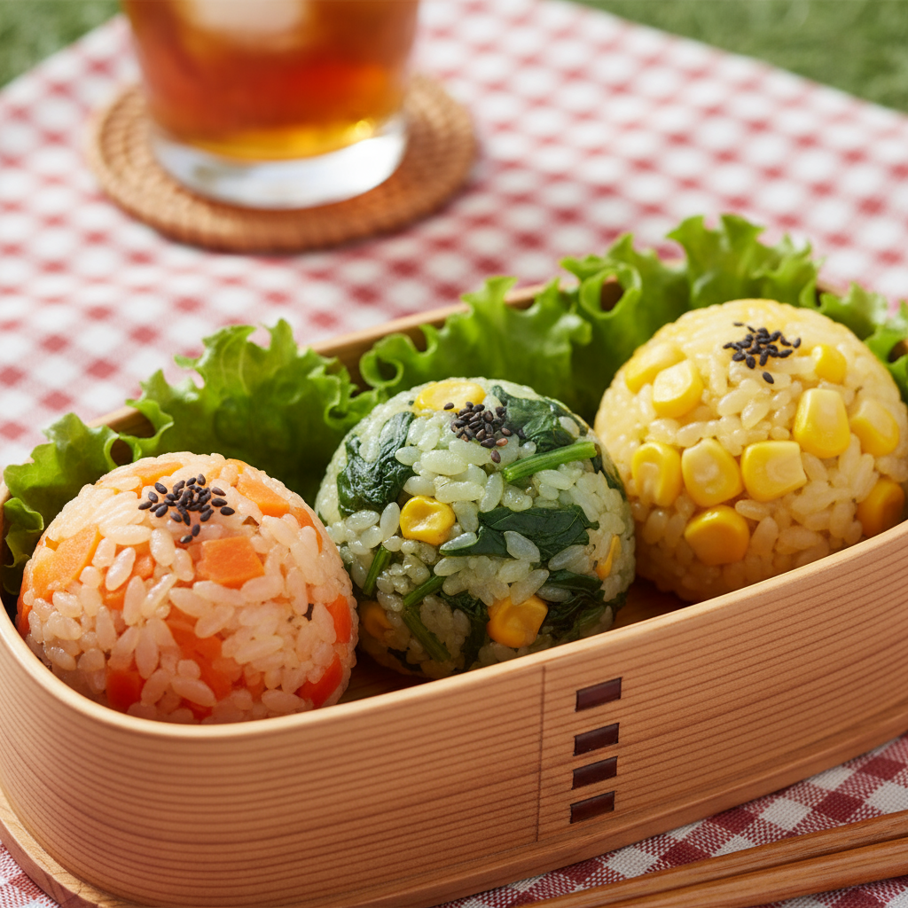 それでは、ピクニックにぴったりな具体的なメニューをご紹介していきましょう。まずは定番のおにぎりです。でも、普通のおにぎりではなく、具材を工夫して見た目も楽しい「カラフルおにぎり」を作ってみましょう。白いご飯に、青じそ、人参、かぼちゃなどをそれぞれ混ぜ込んで、naturally colorfulなおにぎりに。具材には梅干しや鮭、ツナマヨなど、保存の効く食材を選びましょう。