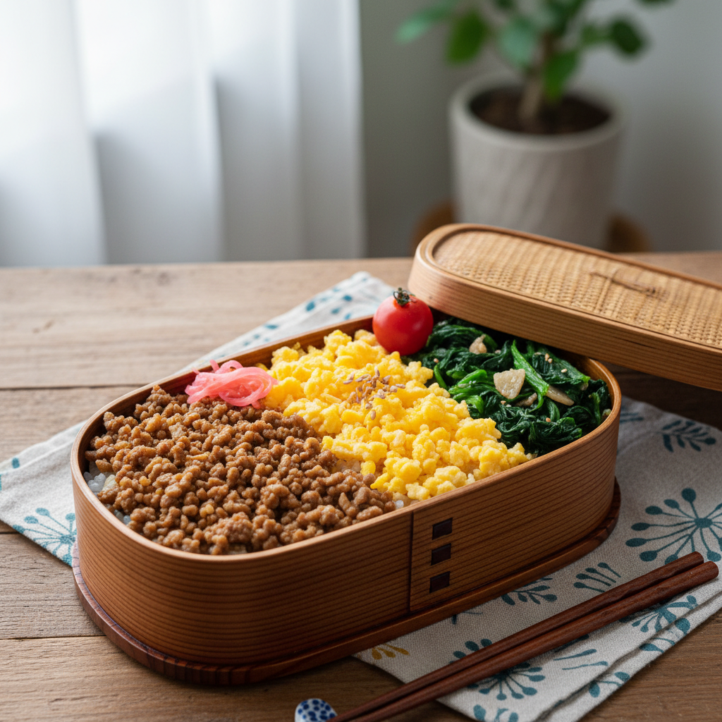まずおすすめしたいのが「彩り三色そぼろ弁当」です。作り方は驚くほど簡単で、前日の夜に十分程度で準備できます。鶏ひき肉を醤油、みりん、砂糖、生姜で甘辛く炒めた茶色のそぼろ、卵を砂糖と塩で味付けして細かくした黄色の炒り卵、そしてほうれん草を茹でて胡麻和えにした緑のそぼろ。この三色をご飯の上に美しく並べるだけで、会社のデスクで蓋を開けた瞬間に気分が上がります。色鮮やかな見た目は視覚から元気をもらえますし、甘辛い味付けは疲れた体に染み渡ります。タンパク質、炭水化物、ビタミンがバランスよく摂れるので、午後からの会議やデスクワークにも集中できるでしょう。