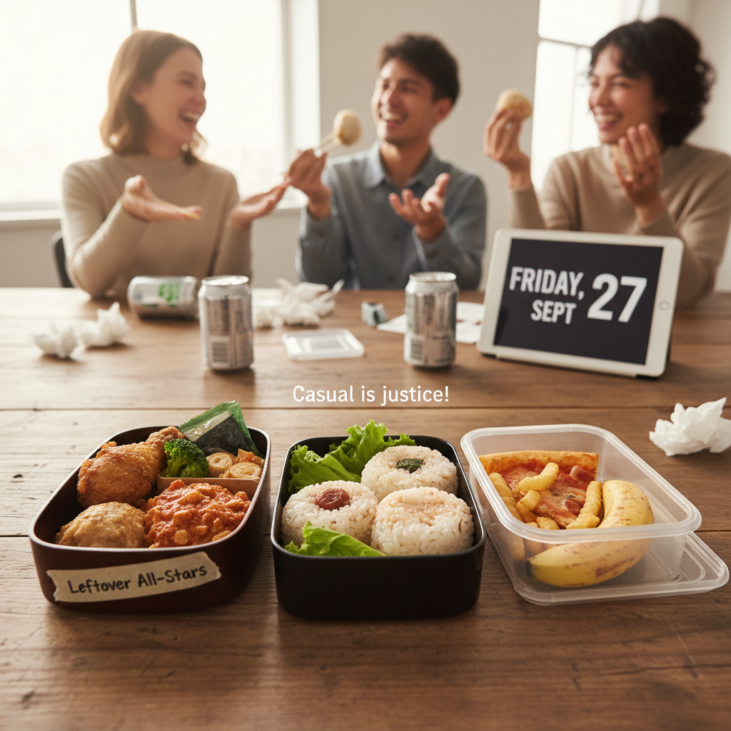 ちなみに私が一番好きな金曜弁当は「おにぎり弁当」。おにぎり3個だけ。具は鮭、昆布、梅干しの定番トリオ。おかずなし。潔い。これを午前中に2個食べて、午後に1個残しておく。そうすると15時くらいのダレる時間帯に「あ、まだおにぎり残ってた」っていう小さな幸せが訪れる。金曜日の午後なんて誰も集中してないし、おにぎり食べながらメールチェックしてるくらいがちょうどいい。